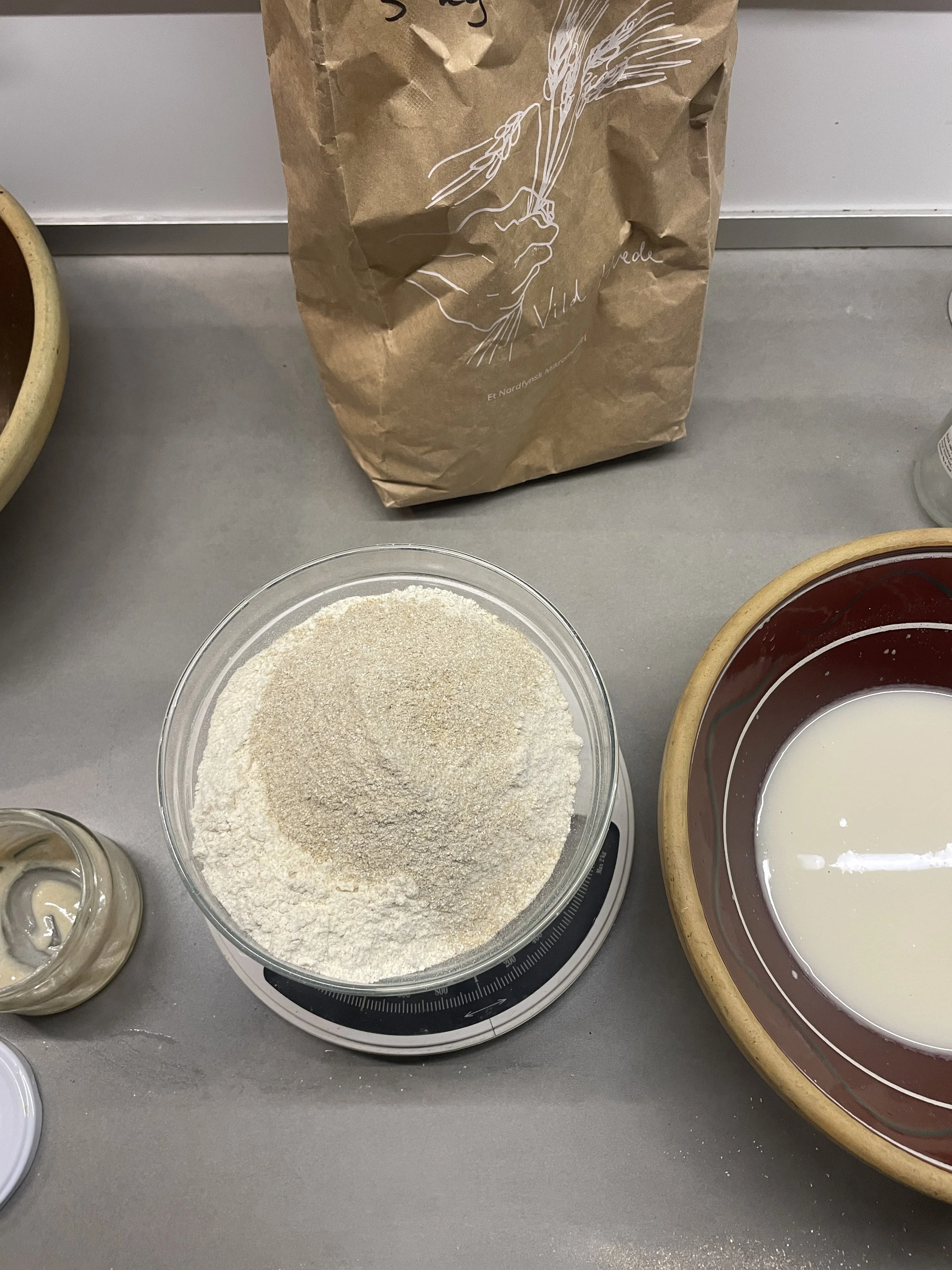Bland mel og vand (ikke for koldt) og surdej til en ensartet dej (ingen tørre klumper). Husk at tage surdej fra.